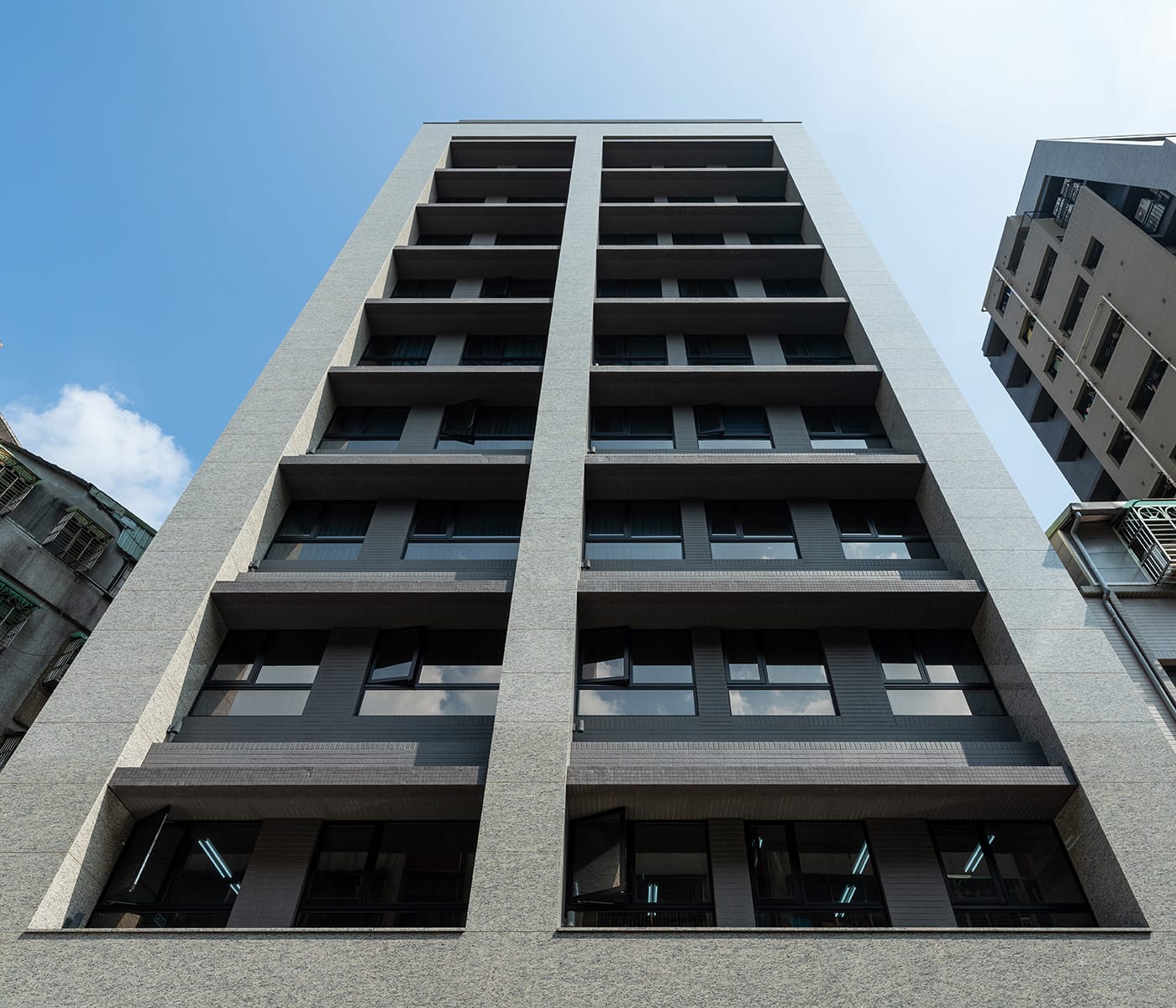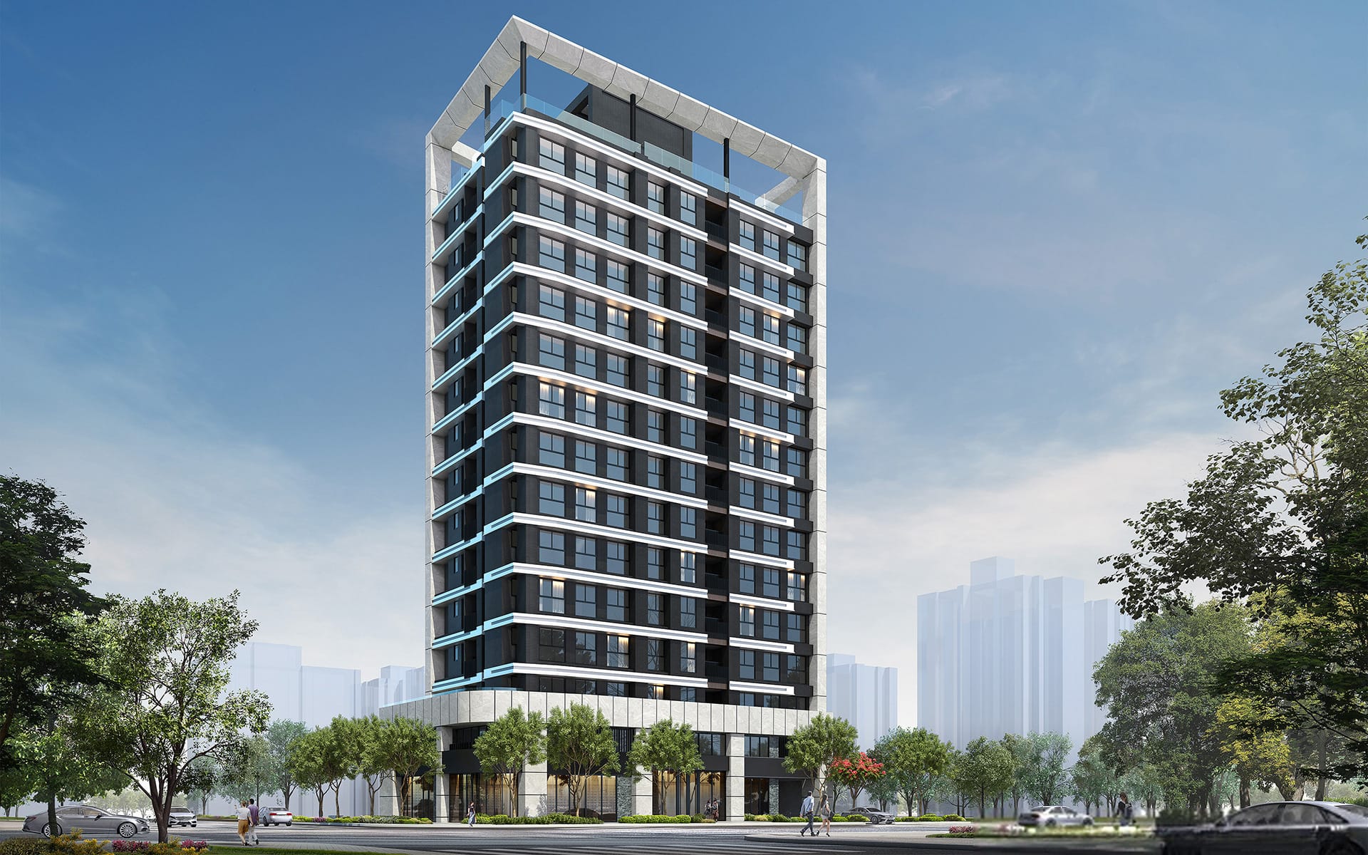 建築設計參考周遭對比色,以簡約為原則,融入周圍環境。運用水平線條勾勒都市生活,橫向玻璃窗及垂直遮陽板調配和諧建築表情。轉角立面延伸線條,外觀立體層次分明;宏偉質樸的屋頂設計,為區域創造天際線的變化。